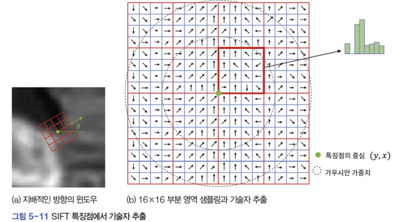 👉🏻 위 방법을 이용하여 SIFT 특징점의 위치와 스케일 정보를 알아내면, 특징점 주위를 살펴 기술자 description(특징 벡터)를 추출함.
