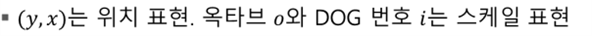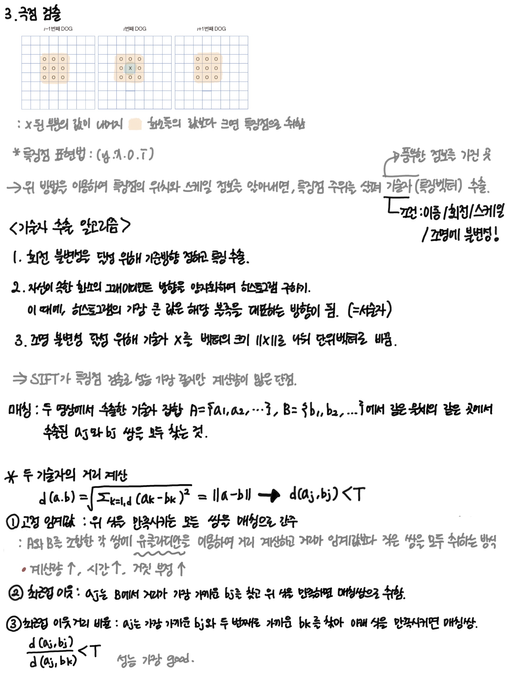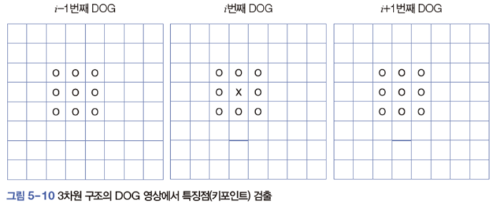 다중 스케일 영상에 미분 적용 : SIFT는 정규 라플라시안을 사용하는데, 이는 계산량이 많기에 시간이 오래 소요됨. 이와 유사한 DOG(그림 b)를 이용할 수 있는데, 이는 이웃한 영상을 화소별로 빼면 되는 것으로 속도가 빠르고 한 옥타브에 다섯 장의 DOG영상이 생김. (스케일이 같은 한 옥타브 내에서만 사용 가능.)