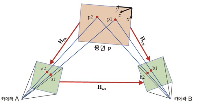 3차원 점p를 동차 좌표로 표현하면4차원 벡터가 되고,투영을 위한 변환 행렬이4*4가 됨.이때, p1과p2를 같은 평면 상에 있다고 가정하여z=0으로 여기면 3*3행렬로 표현할 수 있는데,이러한 제한된 상황에서 이루어지는 투영 변환을 평면 호모그래피라 부름