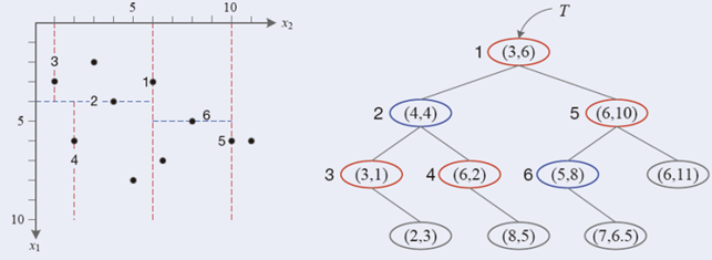 i번째 기술자 x’i의 d개 축중에 분산 값이 가장 큰 축 k를 선택한 다음 k번째 축의 값이 x’k보다 작으면 왼쪽 크면 오른쪽으로 분류한 뒤 왼쪽값 중 중앙값을 트리의 원 안에 위치시키고 원의 색과 같은 특징을 이용하여 몇 번째 축을 사용하였는지 기록