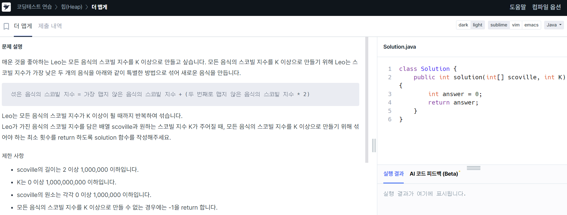 이번 코딩테스트 스터디 주차 주제가 "정렬"이라 Arrays를 사용해서 풀어야지 하고 정렬을 계속해서 시킨 뒤, 사용한 값을 스코빌 지수로 설정한 값으로 변환하는 알고리즘으로 풀었는데 (아래 코드 참조)
